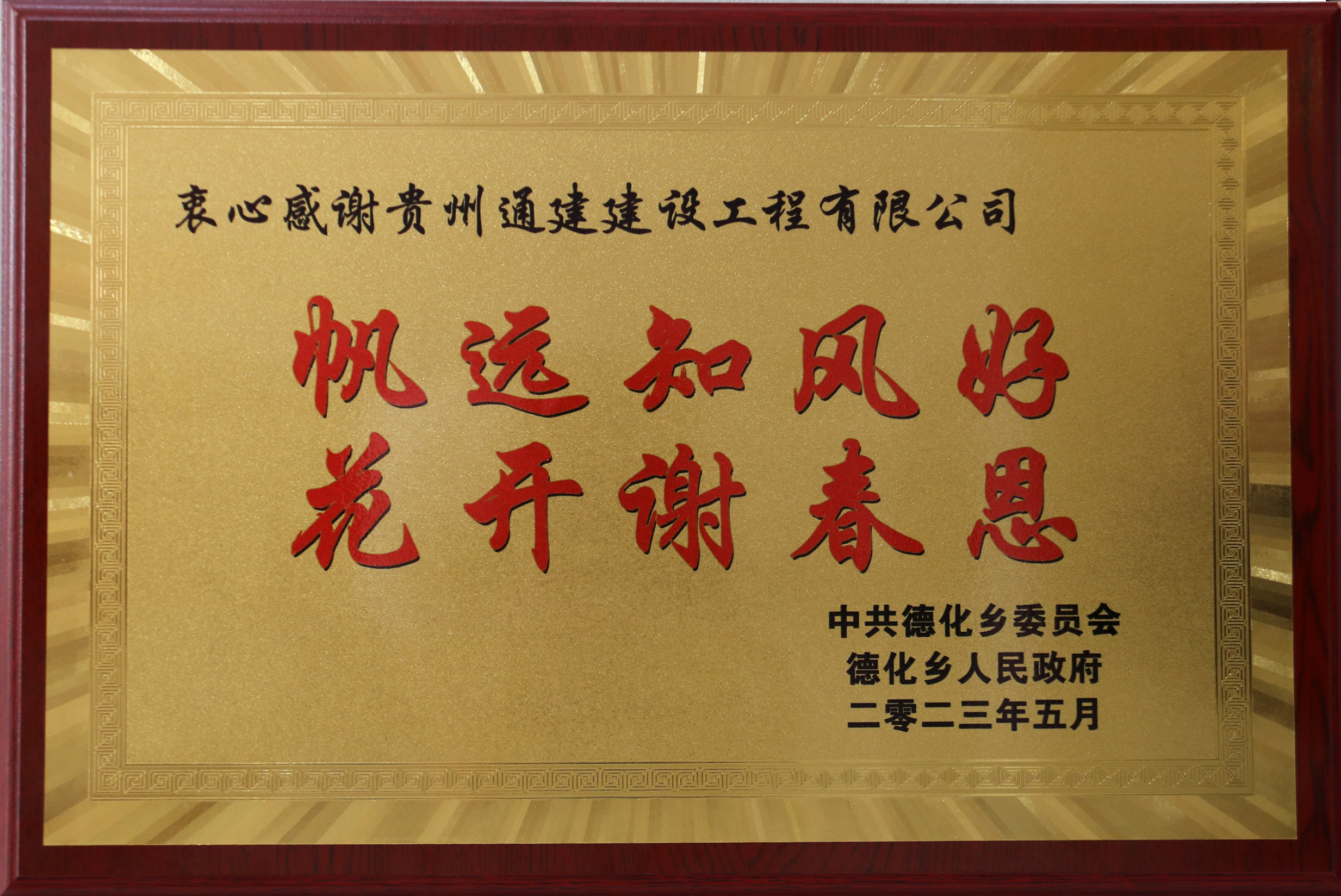近日,黎平县德化乡党委书记吴育柱、德化乡党委委员、武装部部长、副乡长袁仁锦等一行专程来到贵州通建建设工程有限公司,代表中共德化乡委员会、德化乡人民政府及德化乡的父老乡亲,将印有“帆远知风好,花开谢春恩”的牌匾,亲手赠送到贵州通建建设工程有限公司常务副总经理吴香柳、总经理助理付金成手中,以感谢贵州通建公司一直以来对德化乡的倾情帮扶,助力乡村振兴。