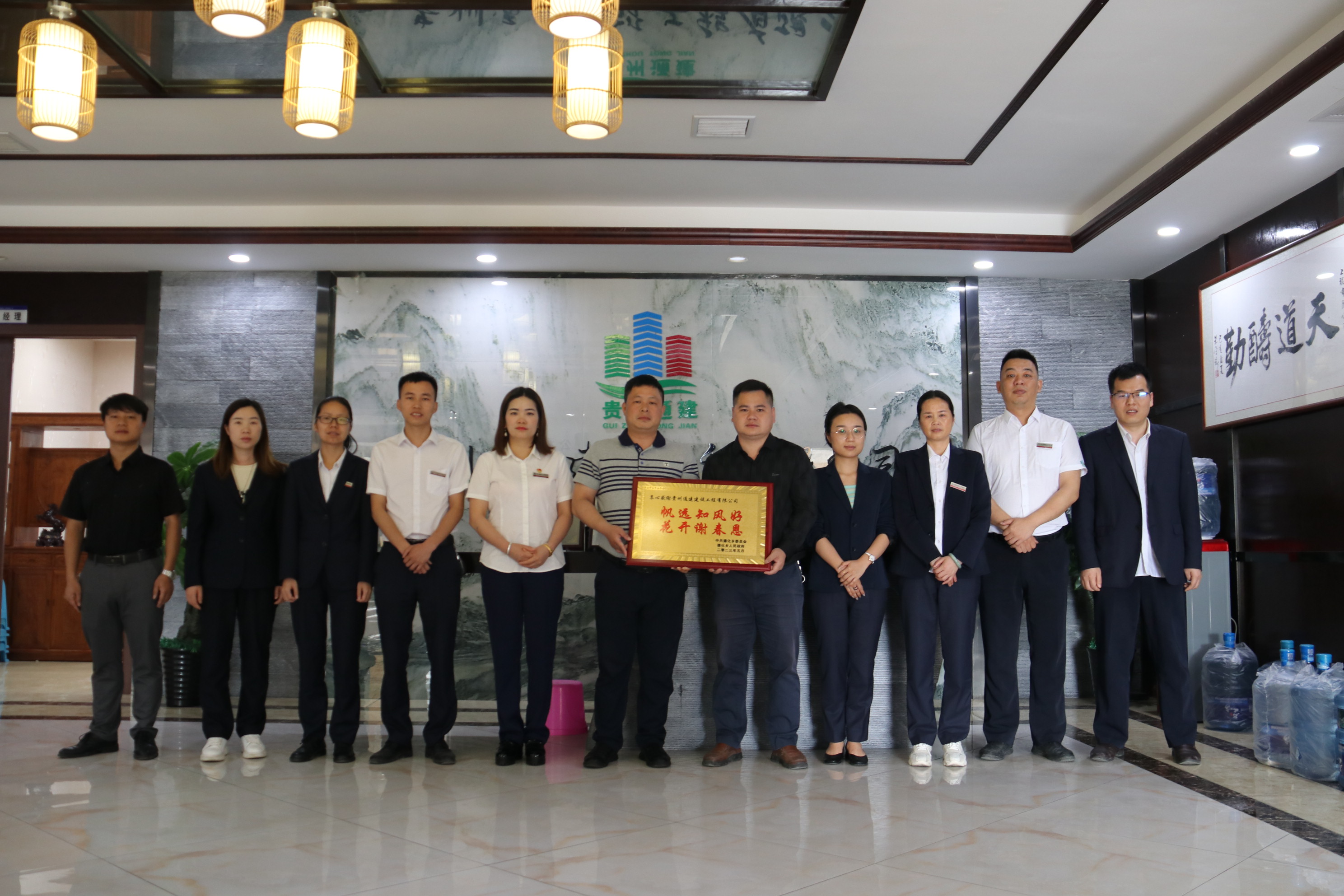 近日,黎平县德化乡党委书记吴育柱、德化乡党委委员、武装部部长、副乡长袁仁锦等一行专程来到贵州通建建设工程有限公司表中共德化乡委员会、德化乡人民政府及德化乡的父老乡亲,将印有帆远知风好,花开谢春恩”的牌匾,亲手赠送到贵州通建建设工程有限公司常务副总经理吴香柳总经理助理付金成手中,以感谢贵州通建公司一直以来对德化乡的倾情帮扶,助力乡村振兴